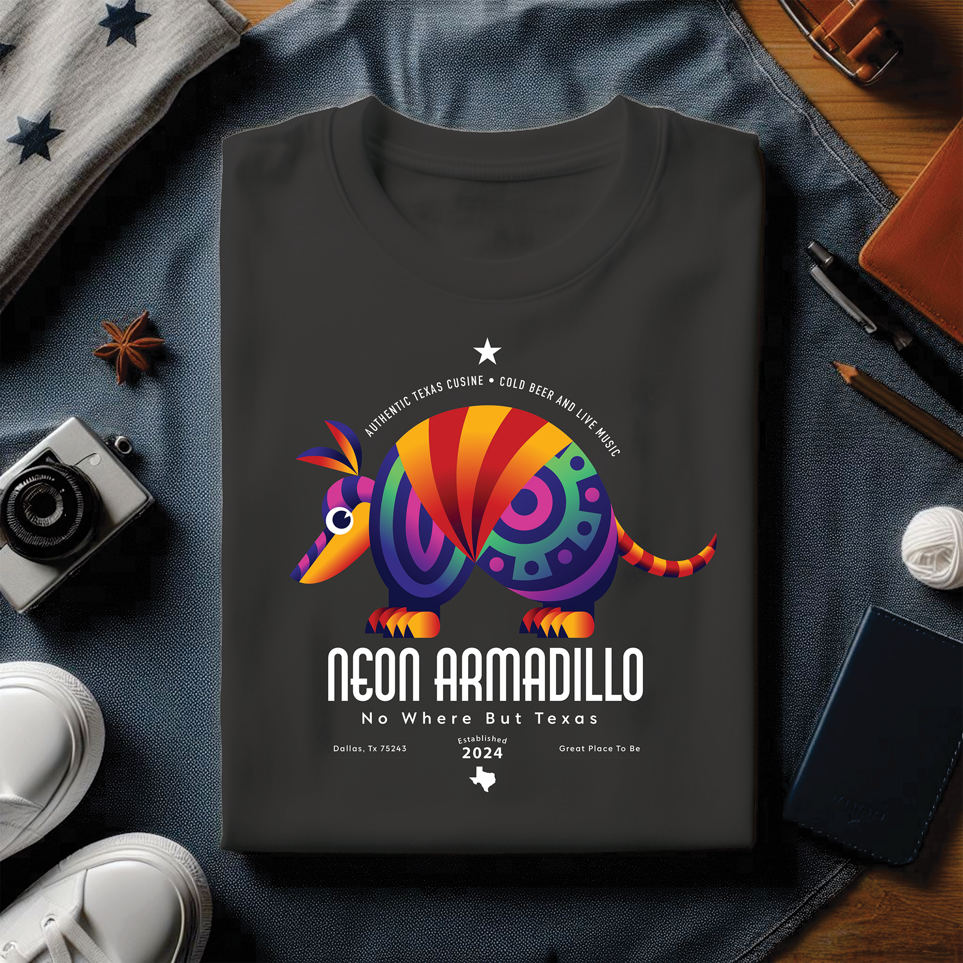 Offered up from our own personal sweat shop. The Neon Armadillo shouts now where but Texas and fits in anywhere. Downtown at night, in the classroom, lounging at home with a good book, or in the gym.